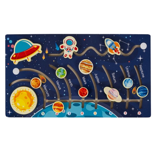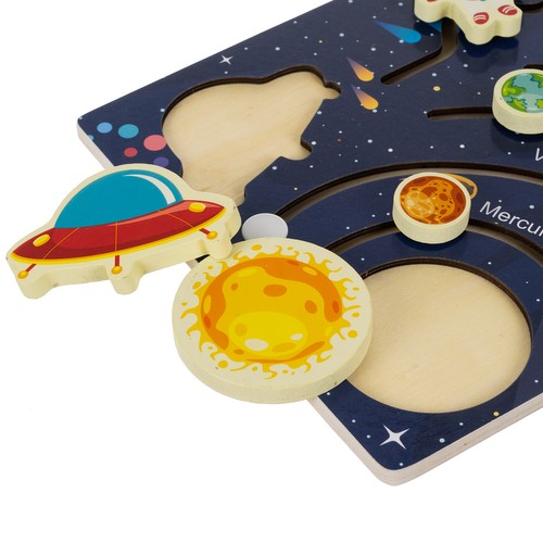 Το ξύλινο παζλ "Ηλιακό Σύστημα" , από την εταιρεία Kruzzel, είναι ένα διαδραστικό εκπαιδευτικό παιχνίδι που αναπτύσσει τις γνώσεις του παιδιού για τους πλανήτες και το διάστημα. Η επιφάνεια του πίνακα περιλαμβάνει κινούμενα, χρωματιστά στοιχεία που απεικονίζουν όλους τους πλανήτες του Ηλιακού Συστήματος. Στόχος του παιδιού είναι να μετακινεί τους πλανήτες σε ειδικές διαδρομές και να τους ταιριάζει στα κατάλληλα ονόματα και αριθμούς που φαίνονται στο κάτω μέρος του πίνακα. Κάθε πλανήτης έχει αρίθμηση, που βοηθά στη μάθηση της σειράς των πλανητών στο ηλιακό σύστημα, καθιστώντας το παιχνίδι ιδανικό για μάθηση και διασκέδαση, ενώ παράλληλα αναπτύσσει τις κινητικές δεξιότητες. Είναι κατασκευασμένο από ξύλο πεύκου, προσφέροντας ανθεκτικότητα και αισθητική εμφάνιση. Η επιφάνεια του πίνακα είναι καλυμμένη με επιστρωμένο χαρτί, που του δίνει λεία υφή και ανθεκτικότητα στη φθορά. Επιπλέον, όλες οι άκρες είναι προσεκτικά στρογγυλεμένες, καθιστώντας το παιχνίδι ασφαλέστερο, εξαλείφοντας τον κίνδυνο τραυματισμού.