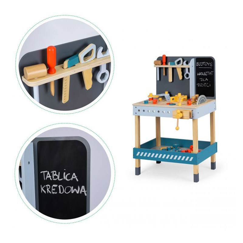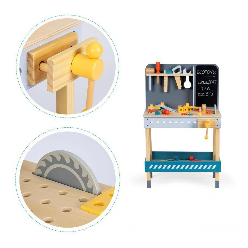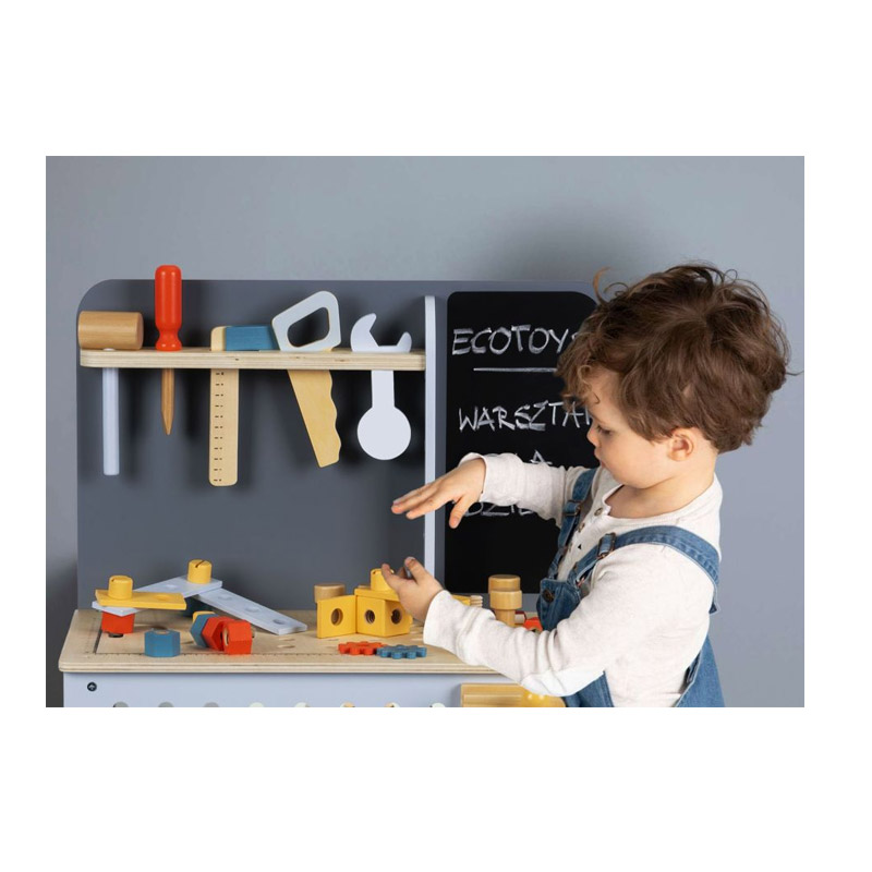 Ο ξύλινος παιδικός πάγκος εργασίας, από την εταιρία Ecotoys, βοηθά το παιδί να αναπτύσσει τη φαντασία του παίρνοντας το ρόλο ενός πραγματικού μάστορα. Εκπαιδεύει αυτό ώστε να λειτουργεί μέσα στο σύνολο ενώ ταυτόχρονα μαθαίνει να οριοθετεί το χώρο του κάνοντας μαστορέματα πάνω στο πάγκο.