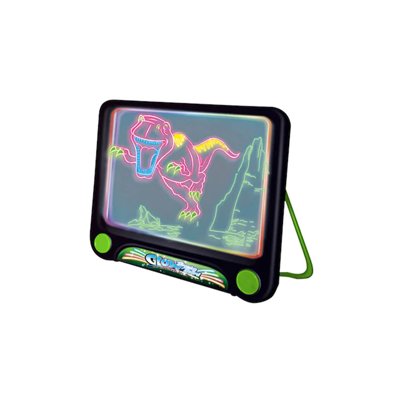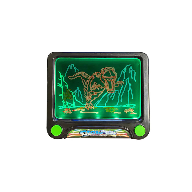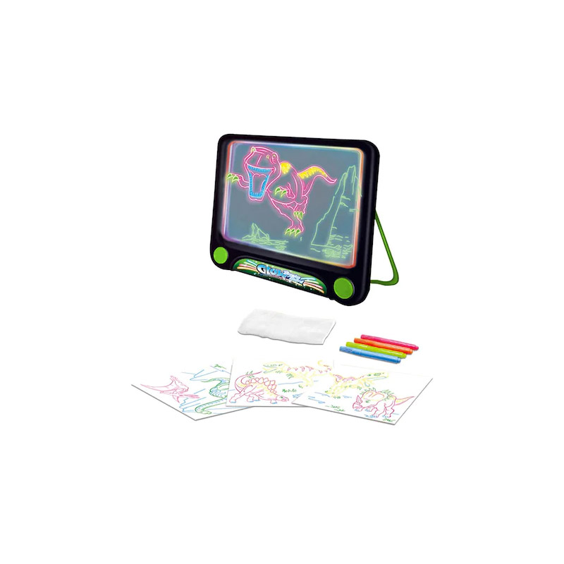 Ο μαγικός πίνακας, διαθέτει διάφανη επιφάνεια, η οποία φωτίζεται με LED φως όταν σχεδιάσετε πάνω της. Τα παιδιά μπορούν να σχεδιάσουν με τη βοήθεια των 4 προεγκατεστημένων πρότυπων που υπάρχουν, με τα στένσιλ νέον που περιλαμβάνονται ή και χωρίς αυτά αναπτύσσοντας τη φαντασία τους. Η επιφάνεια καθαρίζεται εύκολα με το πανί καθαρισμού, ώστε τα παιδιά να μπορούν να δημιουργήσουν ξανά αμέσως.