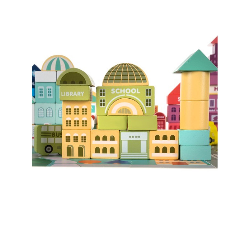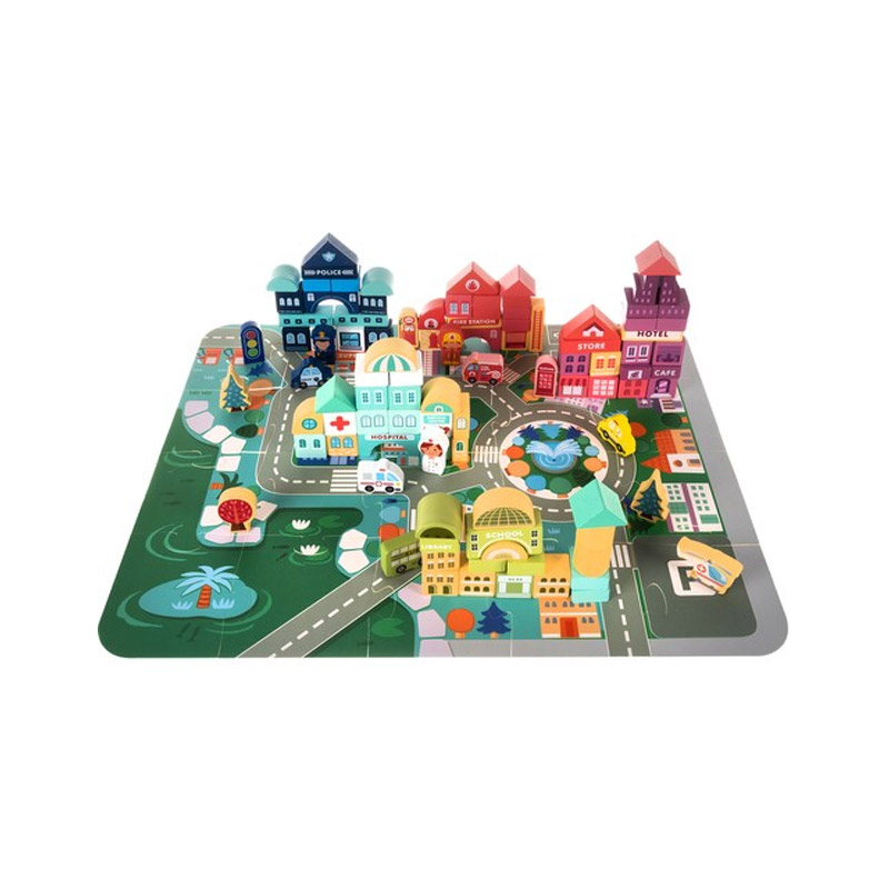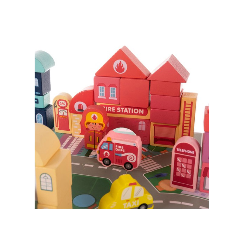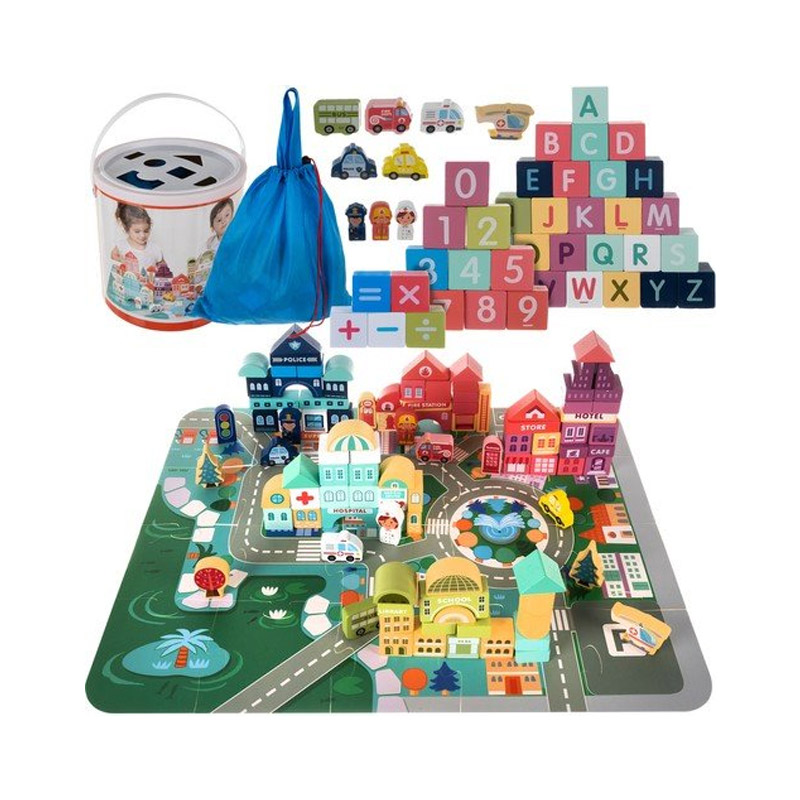 Το σετ περιλαμβάνει τουβλάκια με γράμματα, αριθμούς, σύμβολα, τουβλάκια που συνθέτουν κτίρια μια πόλης, ξύλινες φιγούρες ανθρώπων - οχημάτων,χαλάκι με τύπωμα δρόμων, πάρκων, κτιρίων. Επίσης συνοδεύεται από τσάντα και κουβαδάκι αποθήκευσης και μεταφοράς.
