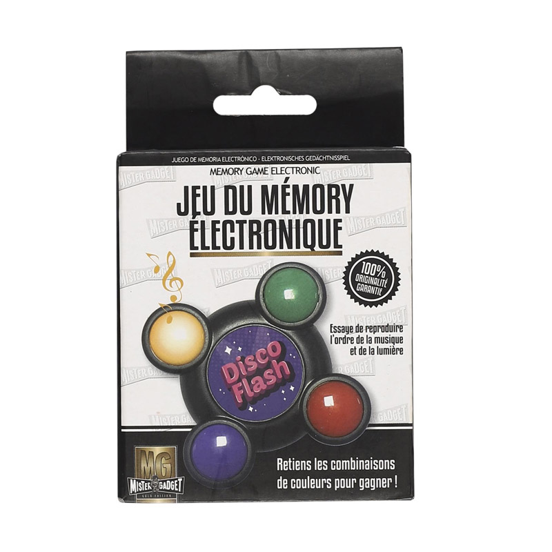Το ηλεκτρονικό παιχνίδι μνήμης, από την εταιρία MISTER GADGET, βοηθά στην ανάπτυξη των γνωστικών τους δεξιοτήτων και των δεξιοτήτων συγκέντρωσης. Γύρω από το κουμπί έναρξης υπάρχουν τέσσερα χρώματα. Όταν ανάβει ένα τυχαίο χρώμα θα πρέπει να πατήσετε το αντίστοιχο κουμπί. Κάθε φορά τα τυχαία χρώματα αυξάνονται και θα πρέπει να βρείτε τη σειρά που εμφανίστηκαν.