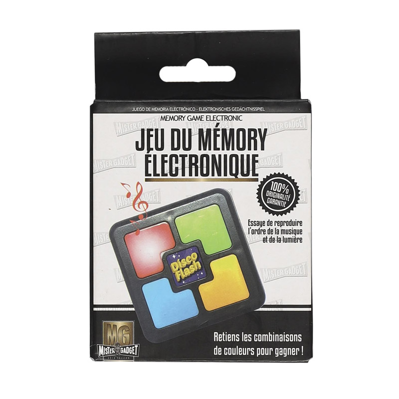 Το ηλεκτρονικό παιχνίδι μνήμης, από την εταιρία MISTER GADGET, βοηθά στην ανάπτυξη των γνωστικών τους δεξιοτήτων και των δεξιοτήτων συγκέντρωσης. Γύρω από το κουμπί έναρξης υπάρχουν τέσσερα χρώματα. Όταν ανάβει ένα τυχαίο χρώμα θα πρέπει να πατήσετε το αντίστοιχο κουμπί. Κάθε φορά τα τυχαία χρώματα αυξάνονται και θα πρέπει να βρείτε τη σειρά που εμφανίστηκαν.