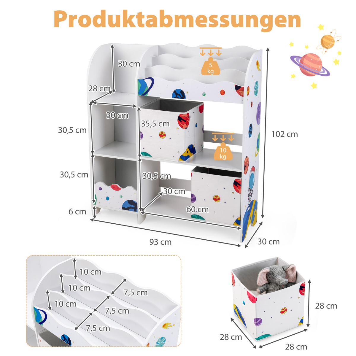 Η βιτρίνα αποθήκευσης μας θα είναι μια εξαιρετική προσθήκη στο παιδικό σας δωμάτιο. Αυτό το ντουλάπι έχει ειδικό ύψος που μπορούν να φτάσουν τα παιδιά, επιτρέποντάς τους να μάθουν να οργανώνουν μόνα τους μετά το παιχνίδι. Με 5 διαμερίσματα, 2 υφασμάτινα συρτάρια και 3 ράφια, το ντουλάπι αποθήκευσης προσφέρει άφθονο χώρο για την έκθεση βιβλίων και την αποθήκευση παιχνιδιών, σνακ και άλλων. Για λόγους ασφαλείας, μπορείτε να στερεώσετε το ντουλάπι στον τοίχο με τις παρεχόμενες αντιολισθητικές συσκευές. Επιπλέον, οι στρογγυλεμένες άκρες και τα αντιολισθητικά μαξιλαράκια ποδιών προσφέρουν επιπλέον ασφάλεια κατά τη χρήση.