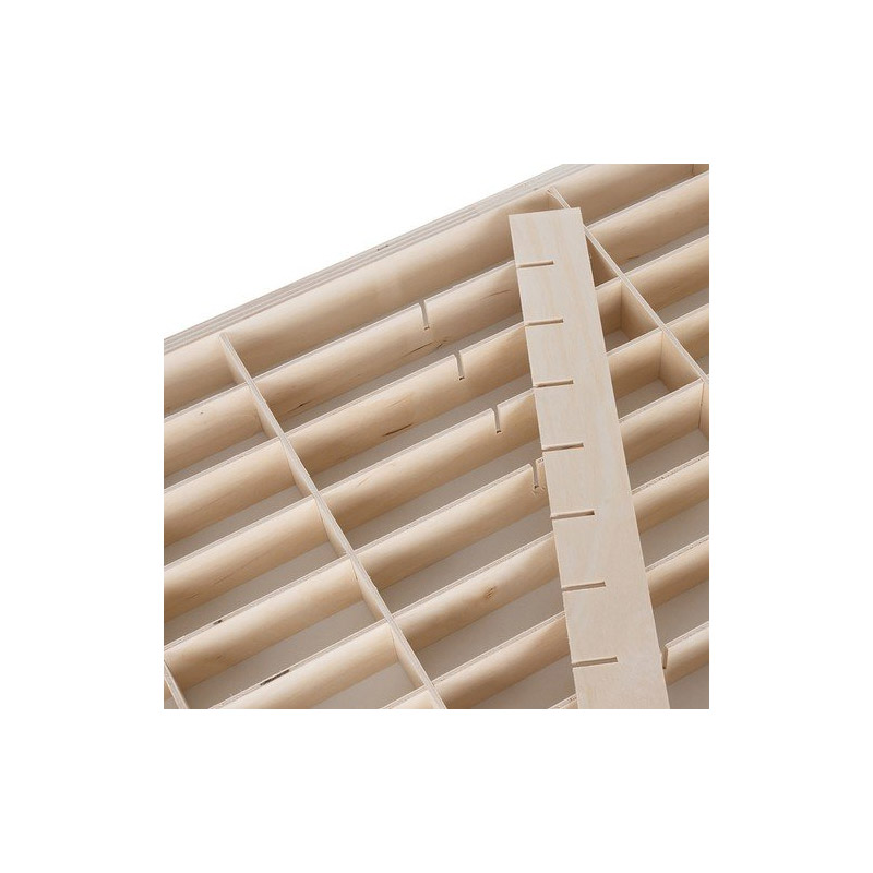 Το ράφι, από την εταιρία Kruzzel, είναι κατασκευασμένο από ξύλινο κόντρα πλακέ και διαθέτει 54 θέσεις για αυτοκινητάκια. Οι θέσεις μπορούν να αφαιρεθούν και να τροποποιηθούν ελεύθερα και μπορείτε να δημιουργήσετε το δικό σας μέγεθος. Είναι σχεδιασμένο για τοποθέτηση σε τοίχο, αλλά μπορεί επίσης να τοποθετηθεί και σε μια συρταριέρα ή ένα γραφείο. Συνοδεύεται από κιτ συναρμολόγησης και δύο γάντζους για κρέμασμα στον τοίχο.