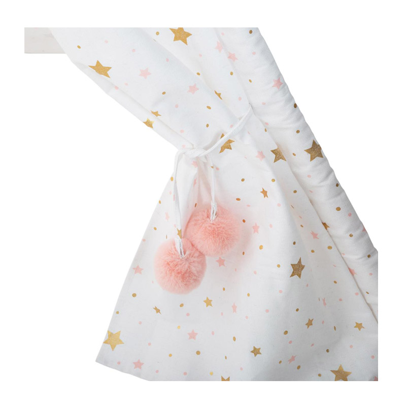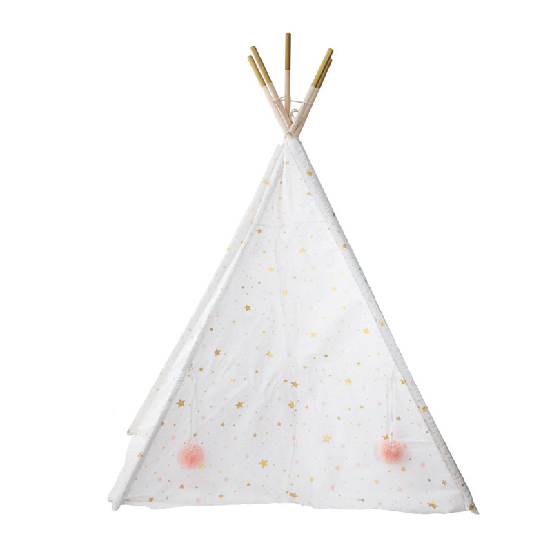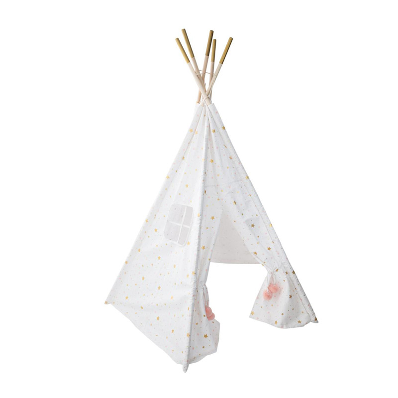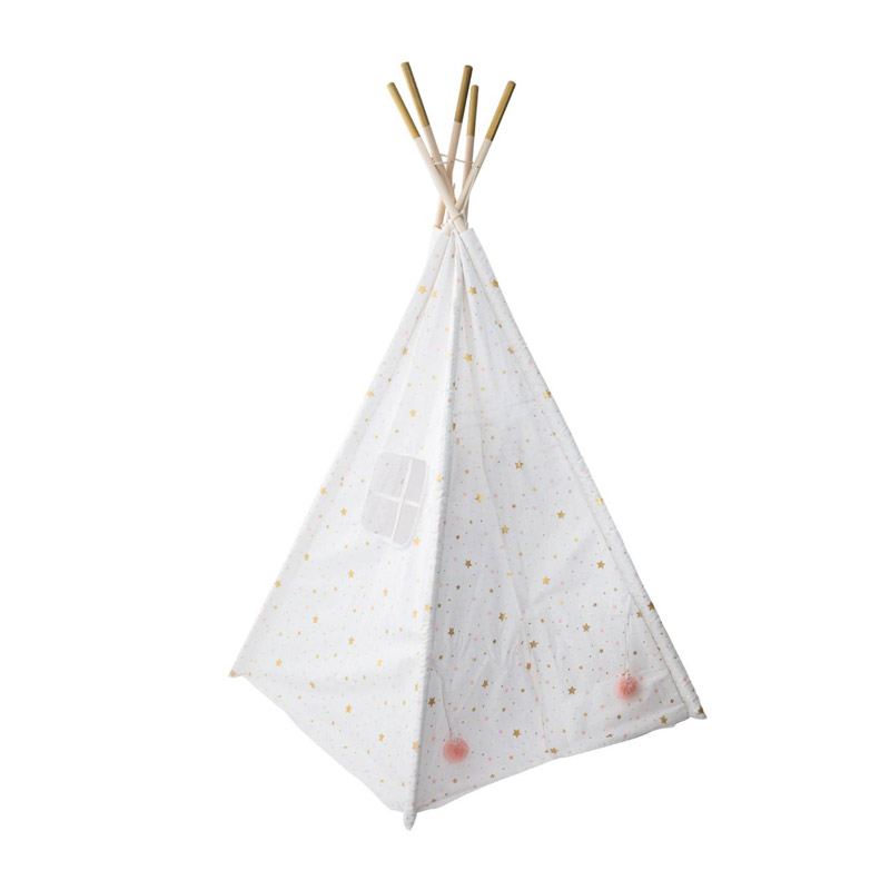 Η παιδική ινδιάνικη σκηνή, από την εταιρία Atmosphera, στήνεται γρήγορα και εύκολα με 5 ξύλα στήριξης. Διαθέτει παράθυρο και πόρτα που μπορεί να είναι κλειστή ή ανοιχτή, καθώς διαθέτει φουντίτσες για να δεθούν. Το ύφασμα της σκηνής είναι κατασκευασμένο από βαμβάκι και polyester σε λευκή απόχρωση με κίτρινα και ροζ αστεράκια. Κατάλληλη για τοποθέτηση σε εσωτερικό χώρο.