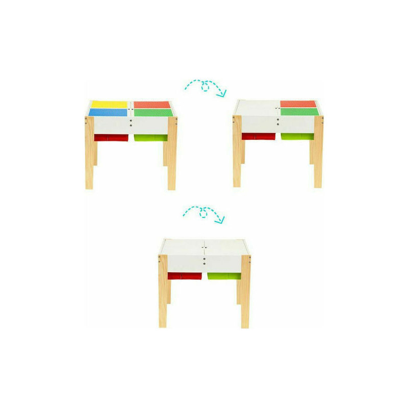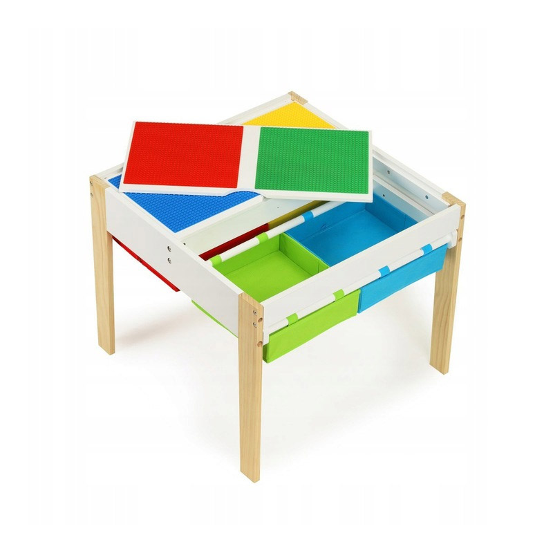 Η επιφάνεια του τραπεζιού αποτελείται από 2 αφαιρούμενα στοιχεία. Στη μία πλευρά υπάρχουν πολύχρωμες σανίδες για την τακτοποίηση μπλοκ, ενώ η άλλη επιφάνεια είναι επίπεδη, που επιτρέπει το σχέδιο, τη ζωγραφική και άλλη δημιουργική διασκέδαση. Χάρη στη δυνατότητα περιστροφής των κορυφών, το τραπέζι μπορεί να προσαρμοστεί τέλεια για παιχνίδι, αν το ένα παιδί θέλει να ζωγραφίσει και το άλλο θέλει να τακτοποιήσει μπλοκ (το μόνο που χρειάζεται να κάνετε είναι να γυρίσετε ένα από τα επάνω στοιχεία).