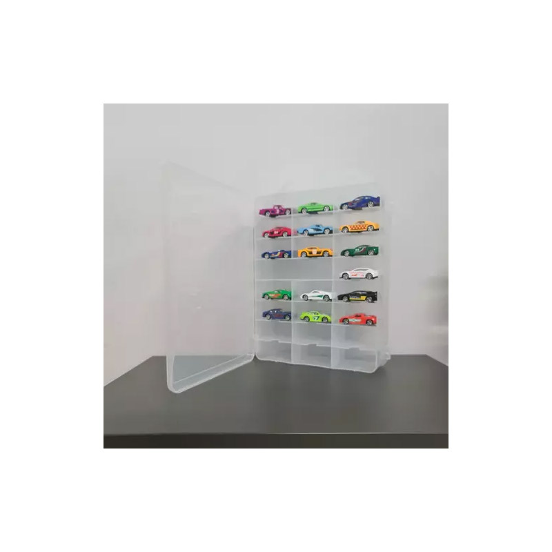 Η βαλίτσα/ράφι, από την εταιρία Kruzzel, είναι κατασκευασμένη από PP υλικό (πολυπροπυλένιο) και έχει 46 θέσεις για αυτοκινητάκια (23 σε κάθε πλευρά). Με λαβή μεταφοράς για να μπορεί να μεταφέρεται με ασφάλεια. Οι πόρτες είναι κλειστές με σφιγκτήρες, χάρη στους οποίους τα αυτοκινητάκια δεν θα πέσουν έξω.